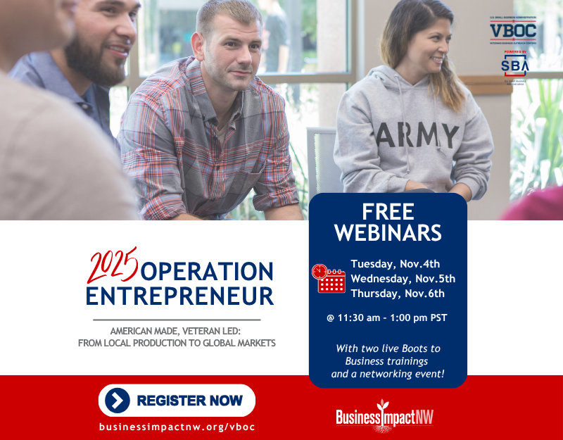 Host Organization: Business Impact NW Description: A free week of business workshops for military-connected entrepreneurs. From certification and lending to scaling and franchising, each session helps you take your next step in business. Join virtually Nov 4–6th. Hosted by: Business...