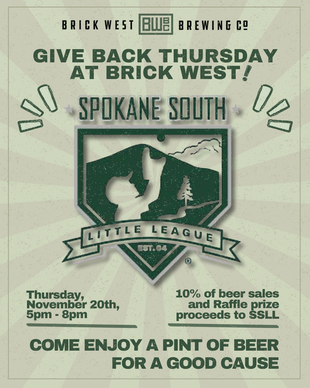 Host Organization: Brick West Brewing Co. Description: Join us on November 20th from 5–8PM as we raise a glass for a great cause! We’re teaming up with Spokane South Little League — a local youth baseball program making the game...