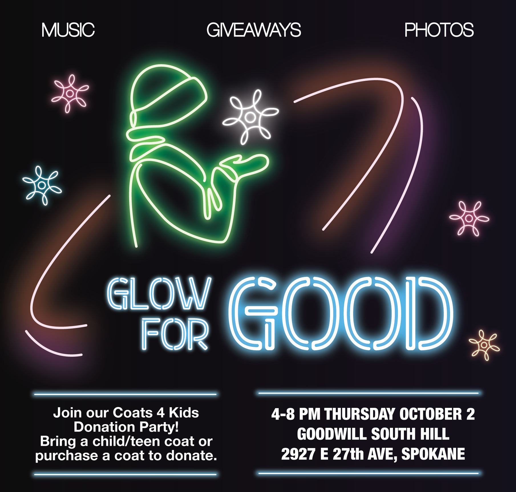 Host Organization: Goodwill Industries of the Inland Northwest Description: Glow for Good! Come to Goodwill’s South Hill store on October 2, anytime between 4–8 PM and donate a coat for kids in need this winter. For every coat you bring...