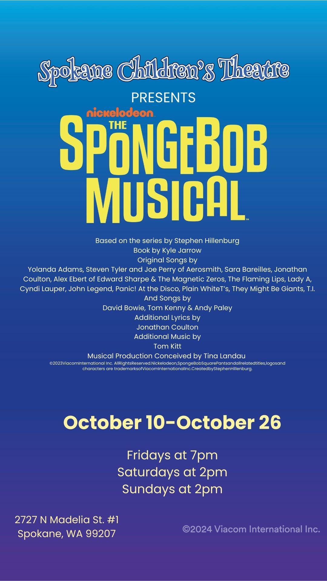 Host Organization: Spokane Children's Theatre Description: When the citizens of Bikini Bottom discover that a volcano will soon erupt and destroy their humble home, SpongeBob and his friends must come together to save the fate of their undersea world. With...