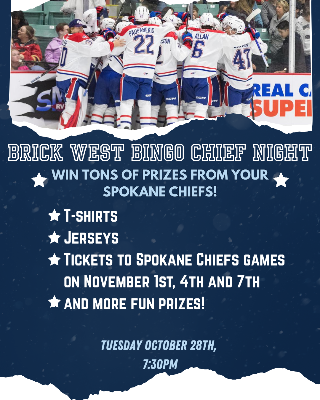 Host Organization: Brick Brewing Co. Description: It’s game night with a twist! Join us at Brick West Brewing on Tuesday, October 28 at 7:30PM for Bingo Chief Night, featuring your Spokane Chiefs! Play for a chance to win tons of...