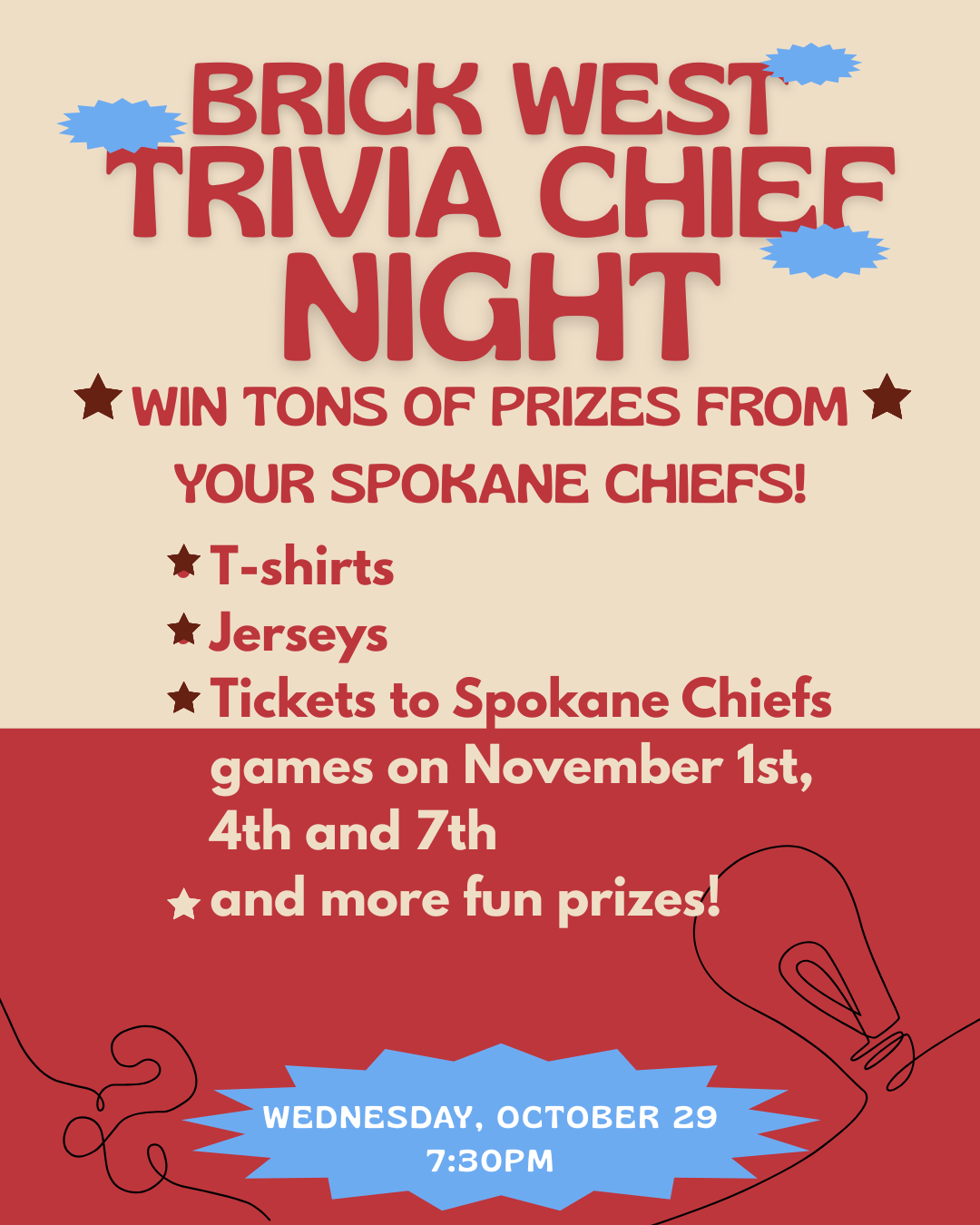 Host Organization: Brick West Brewing Co. Description: Get ready for a night of fun, beer, and hockey trivia at Brick West Brewing! 🏒 Join us for Trivia Chief Night on Wednesday, October 29 at 7:30PM and put your Spokane Chiefs...
