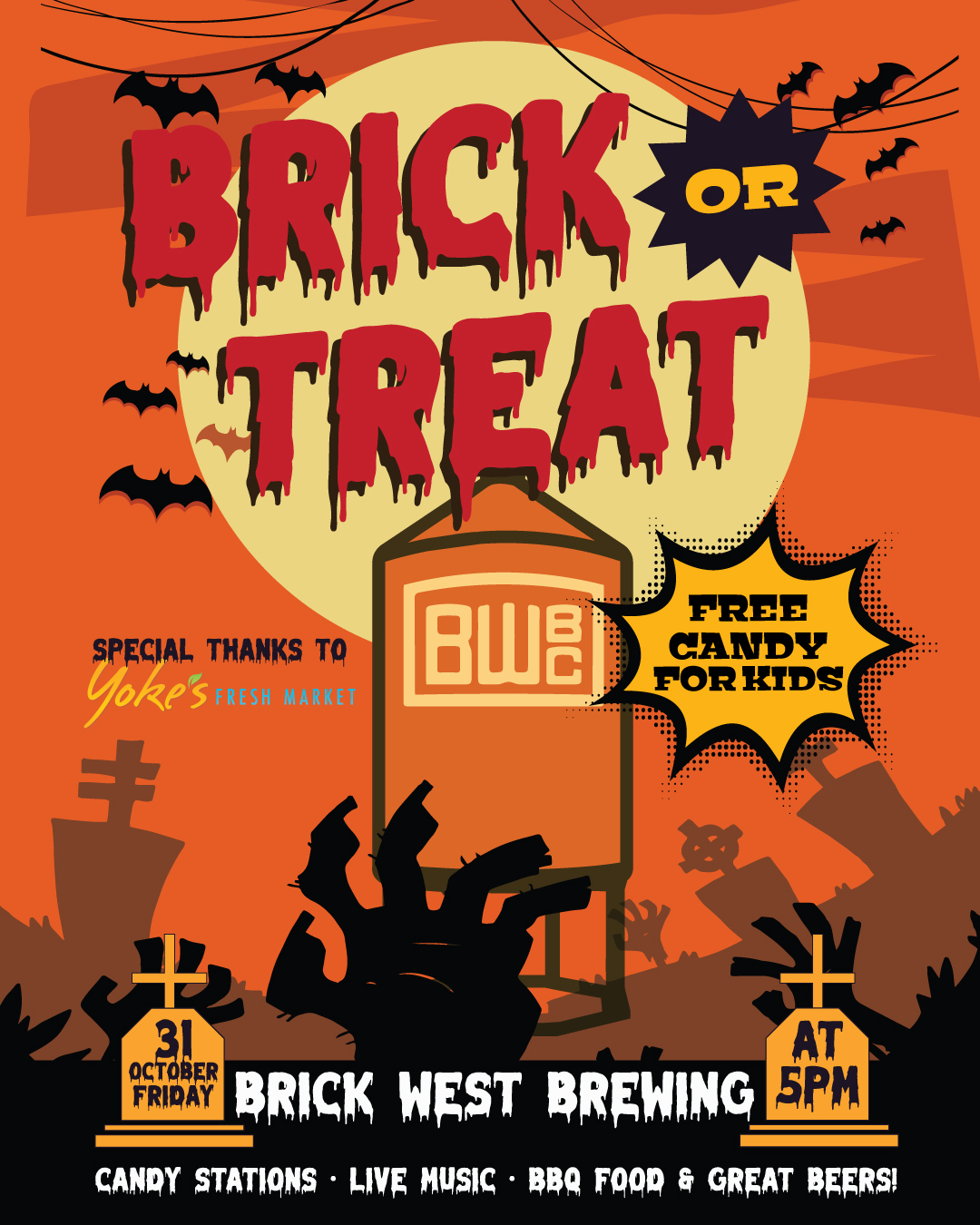 Host Organization: Brick West Brewing Co. Description: Spooky season is here, and Brick West Brewing Co. is celebrating in true Brick West style! 🎃 Join us for Brick or Treat on Friday, October 31 at 5PM, a family-friendly Halloween celebration...