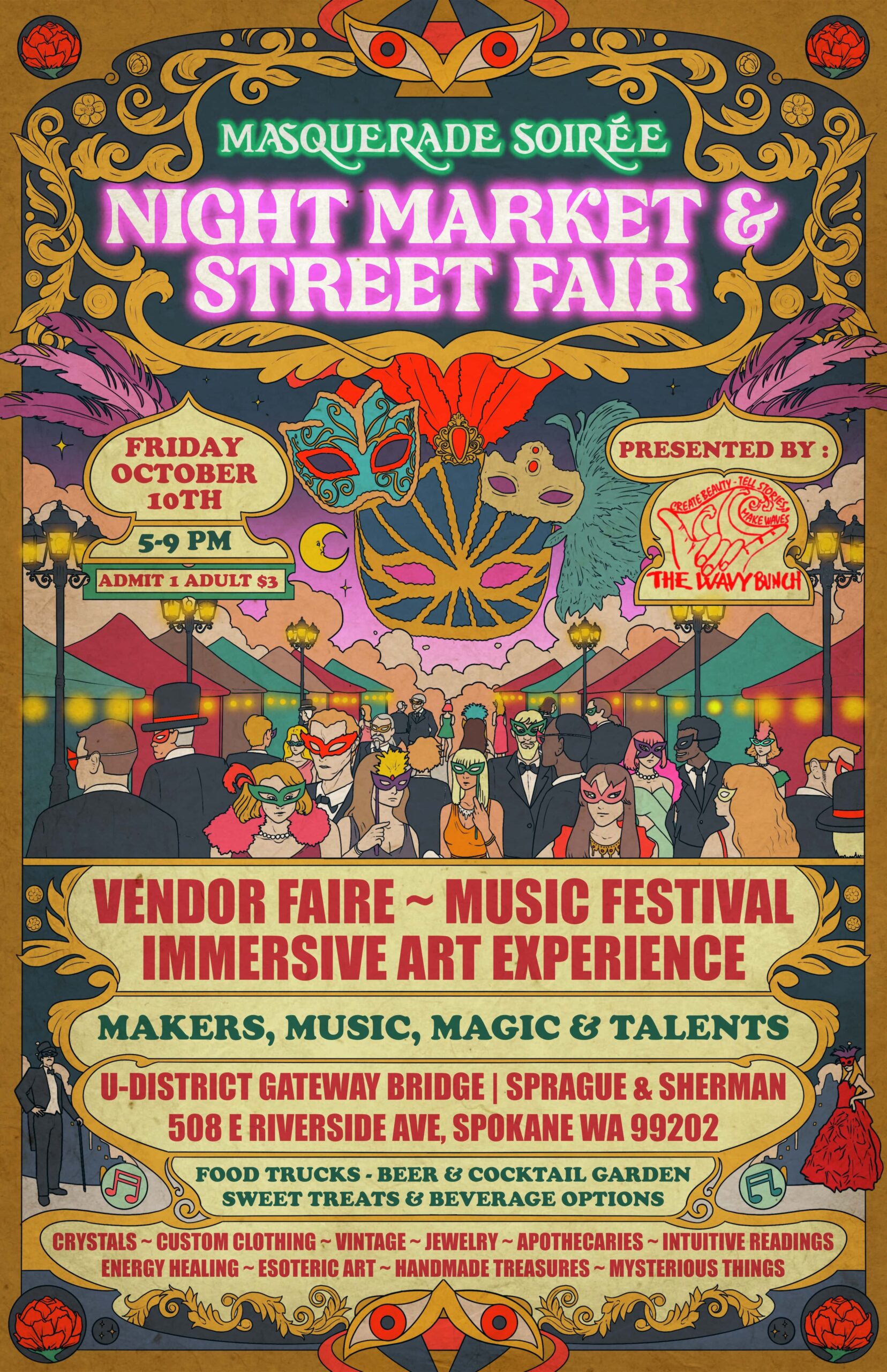 Host Organization: THE WAVY BUNCH Description: 👋 Salutations, merrymakers! 🌙 You’re cordially INVITED to the Masquerade Soirée NIGHT MARKET & Street Fair—Vendor Faire, Music Festival, Immersive Arts Experience & Themed Costume Party for ALL-AGES! 🎭 FRIDAY, October 10th, 5 -...