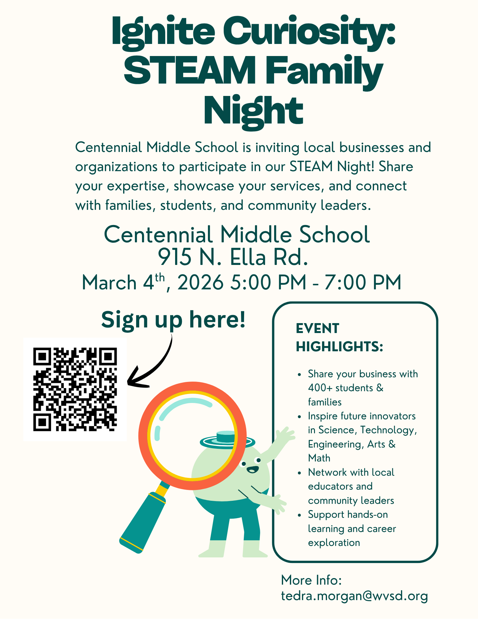 Host Organization: Centennial Middle School Description: entennial Middle School invites local businesses and organizations to join us for our annual STEAM Night! We’re looking for partners in Science, Technology, Engineering, Art, and Mathematics to share their work through interactive, hands-on...