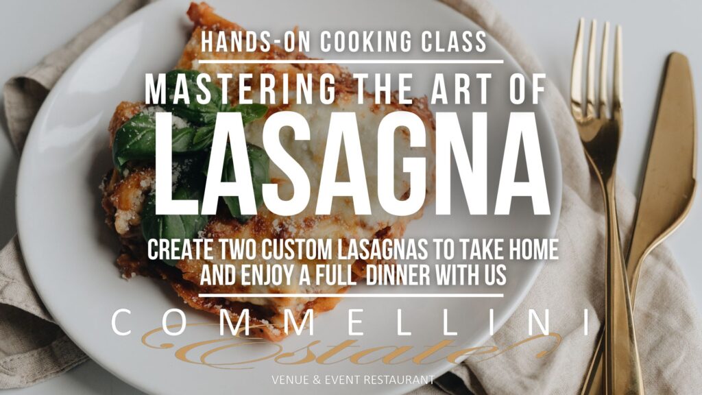 Join Chef Frank in this hands-on cooking class at the historic Commellini Estate and learn how to make an unforgettable lasagna from scratch. Using fresh, high-quality ingredients, you’ll assemble a personal pan of lasagna to take home—perfect for meal prepping. The experience concludes with a full dinner featuring our signature lasagna, served inside the Main Venue.