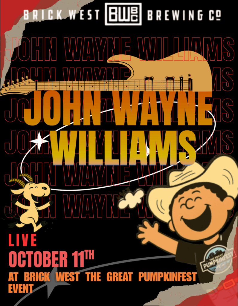 John Wayne Williams is taking the Brick West stage on Saturday, Oct. 11th for a night of great tunes, good vibes, and all the fall fun. 🍂