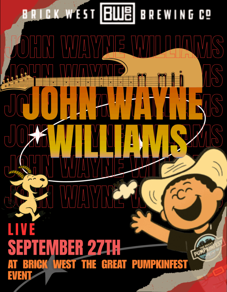 John Wayne Williams is taking the Brick West stage on Saturday, Sept 27th for a night of great tunes, good vibes, and all the fall fun. 🍂