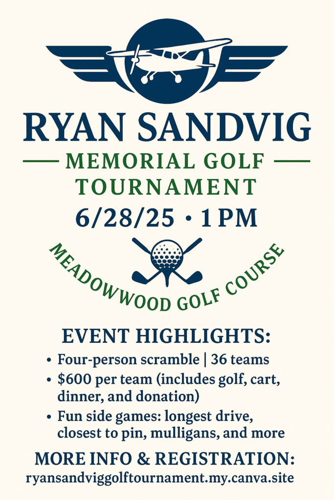 Join us for the Ryan Sandvig Memorial Golf Tournament on Saturday, June 28, 2025, at MeadowWood Golf Course in Liberty Lake, WA. This four-person scramble honors the life of Ryan Sandvig, an aviation enthusiast and mentor, and raises funds for the Ryan Sandvig Scholarship at Moody Aviation. Enjoy a fun-filled day of golf, games, dinner, and community while supporting aspiring mission-driven pilots. Registration includes golf, cart, dinner, and a donation to the scholarship fund. The event will include raffles, giveaways and closest to the pin competitions!