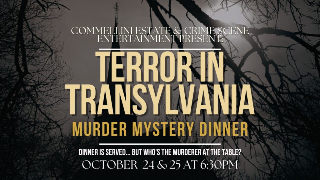 Event Overview: Commellini Estate and Crime Scene Entertainment invite you to Terror in Transylvania, an immersive murder mystery supper where shadows whisper, goblets overflow, and danger stalks the haunted halls of Dracula’s castle.